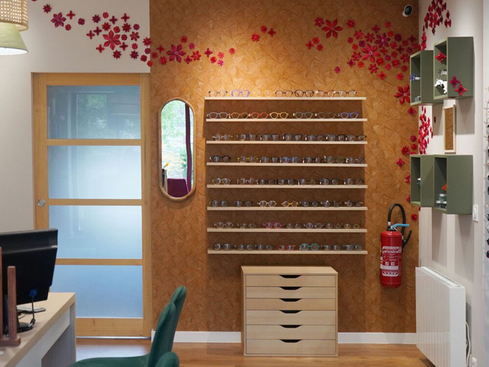 Dans le cadre de l’aménagement du magasin d’optique Ô Belles Lunettes, un décor sur mesure a été imaginé pour mettre en valeur la zone dédiée aux montures « création ».