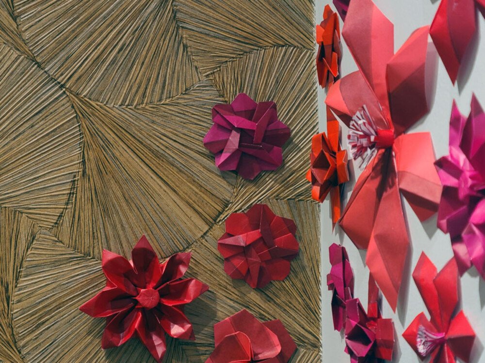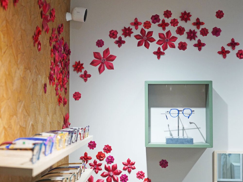 Commandé par Amande Création d’Intérieur, ce dispositif décoratif prend la forme d’une installation d’origamis, conçue comme un élément à la fois graphique et poétique. L’objectif était d’attirer le regard, de structurer l’espace et de souligner l’identité créative des montures exposées, tout en restant au service du produit.