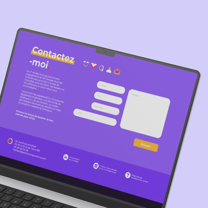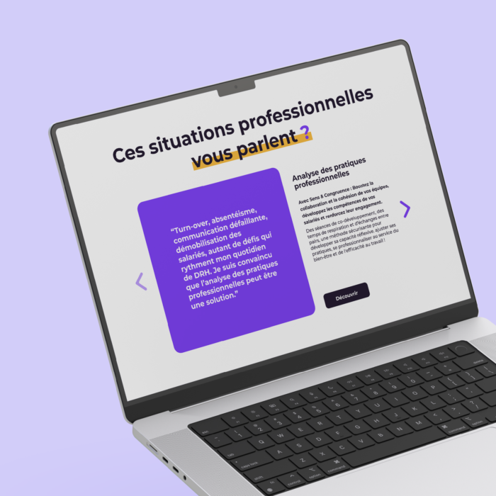 Vous distinguer permet à vos clients de vous remarquer. C’est dans cette optique que nous avons collaboré avec Sens & Congruence, une structure dédiée à l’accompagnement des transitions professionnelles, formation et bilan de compétences. L’objectif : clarifier l’expertise et le positionnement de la marque, co-créer l’identité éditoriale, concevoir une identité graphique impactante accompagnée d’un site web sur mesure pour incarner leur engagement.